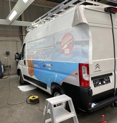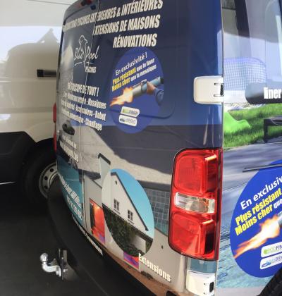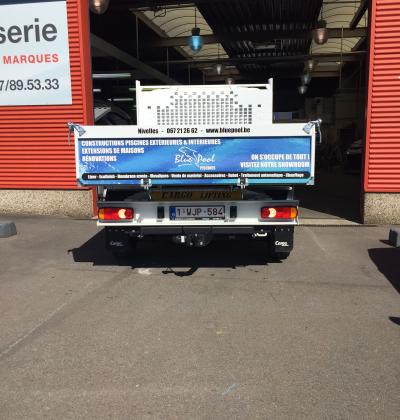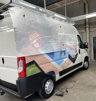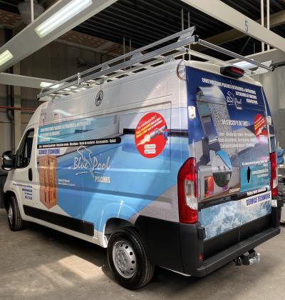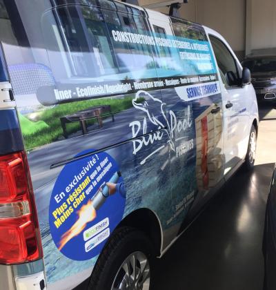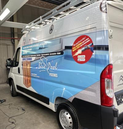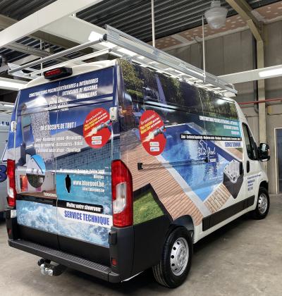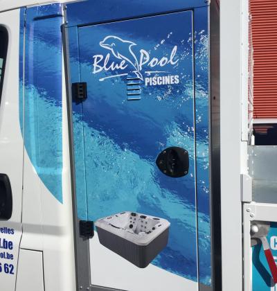 Lettrage véhicule en vinyle imprimé sur mesure pour Blue Pool — construction de piscines, spas et saunas en Brabant wallon. Pose soignée, rendu professionnel, visibilité maximale. Contactez-nous pour un devis gratuit.